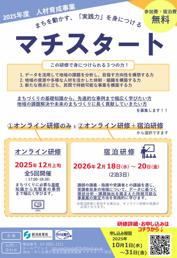 今年も代表の竹林が経済産業省 中小企業庁主催の「まちづくり人材育成研修”マチスタート”」の講師で登壇します。