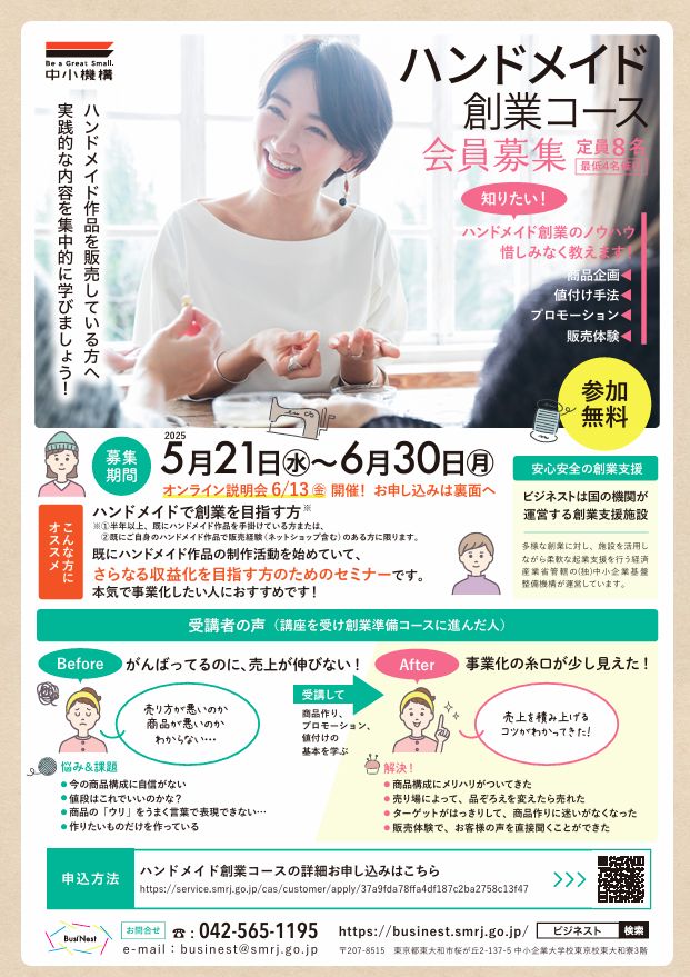 今年も中小機構Businestとの連携企画「ハンドメイド起業コース」でのテスト販売を開催します!